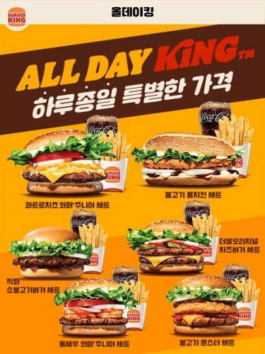 버거킹의 가성비 좋은 메뉴 올데이킹입니다. 올데이킹 구성이 조금 바뀌어서 6 종류로 운영중이랍니다.