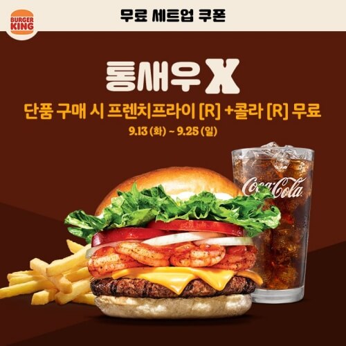 더블 텍사스칠리와퍼 무료 세트업 쿠폰은 2장을 나눠주고 있습니다. 단품 구매시 프렌치 프라이 + 콜라 무료로 업그레이드 받을 수 있습니다.
