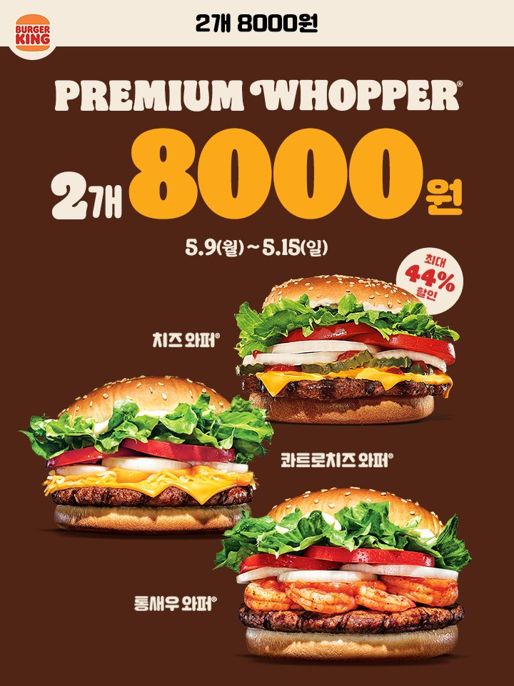 버거킹 행사 소식입니다. 5월 9일부터 시작하는 주요 할인 행사는 프리미엄 와퍼 2개 8000원에 판매하는 것이네요. 버거는 치즈와퍼, 콰트로치즈 와퍼, 통새우 와퍼 3종입니다. 세 버거의 어떤 조합으로 시키더라도 8000원에 드실 수 있습니다.