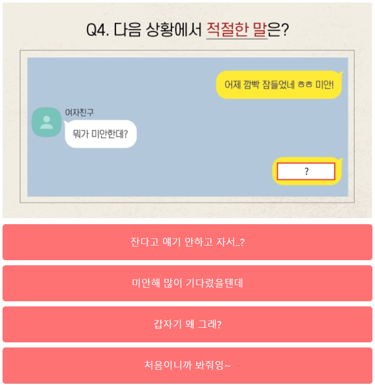 이 문제는 잘 들어갔는지 여부에 대해 여자친구가 답을 안했는데 먼저 잔다고 해서 말이 없어진 것입니다. 정답은 3번이지요.