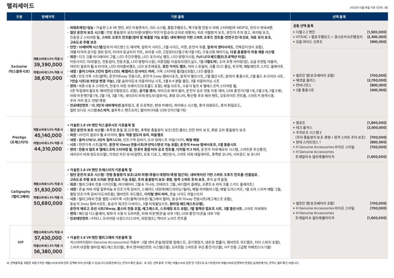 팰리세이드 페이스리프트 가격표