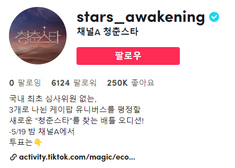 청춘스타 투효가는 방법은 청춘스타 틱톡 페이지에서 진행하고 있습니다. 투표를 하시려면 아래 링크로 가셔서 투표를 하시면 됩니다.